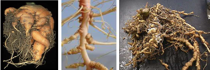 شكل يوضح أعراض مرض تعقد الجذور في الخضر والفاكهة