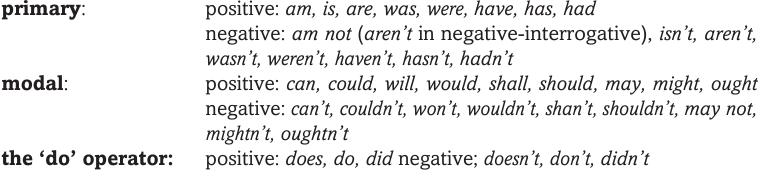 The operator is a verb, of one of the following types: primary, modal or do, as explained below.