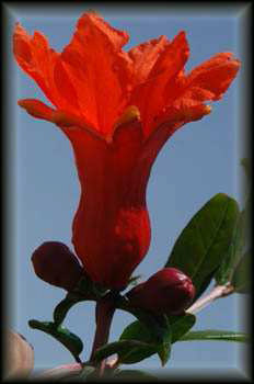أما بالنسبة لورقة الرمان فإنها كاملة رمحيه لامعة من السطح العلوي ملساء تحمل متقابلة على الأفرع ، والأزهار حمراء كبيرة الحجم تتكون من كأس لحمى ملتحم السبلات أحمر اللون ويتكون التويج من ٥ إلى ٨ بتلات حمراء غالبًا سائبة وتخرج الأسدية من السطح الداخلي للتخت الذي يمتد الى أعلى المبيض والتخت أحمر اللون مثل السبلات والبتلات أما المتك فصفراء باهتة ذات قلم قصير الى متوسط والميسم مطمور بين الأسدية والمبيض صغير يتركب من طبقتين مفصولتين بغشاء شفاف وكل طبقة تتألف من عدة حجرات عددها خمسة في أحد الطبقتين وثلاثة في الطبقة الأخرى وتتصل هذه المساكن بأغشية رقيقة شفافة وبكل حجرة بروز عبارة عن جزء من جدار المبيض تلتصق به المشيمة البذرية.