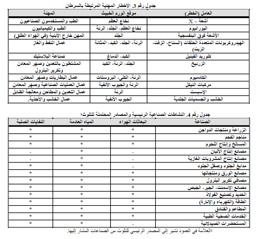 إذا تم اتباع الإجراءات الصناعية والإجراءات الوقائية الصحيحة، فإنه يتم بذلك حماية المواطنين من التعرض إلى المواد الكيميائية التي تنتجها الصناعة. ومع ذلك فإنه يحدث في بعض الأوقات إطلاق المواد الكيميائية سواء كنتيجة حادث أو خطأ. وكمثال على المواد الصناعية الملوثة للبيئة إطلاق الزئبق غير العضوي في البيئة مما ينتج عنه تعرض الإنسان إلى ميثيل الزئبق. إن التعرض الكبير للمواد الكيميائية متوقع رؤيته بشكل أآبر لدى العاملين في تشغيل المعدات وليس غريباً أن نلحظ .(occupational exposure) الصناعية ويُعرف ذلك بالتعرض المهني كما في الجدولين ادناه في بعض الحالات دخول المواد الكيميائية المرتبطة بالأمراض بشكل كبير في عمليات التركيب المهنية. وكأمثلة على الأخطار المهنية الهامة والتي يسلط عليها الضوء وارتباطها بالسرطانات يبينها الجدول ، بينما تم إدراج النشاطات الصناعية الكبيرة ومصادرها المحتملة لتلوث .