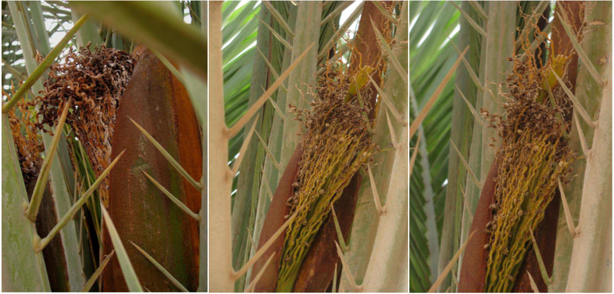 يهاجم المسبب المرضي البراعم الزهرية حال تكونها وهي لا تزال تحت أباط الاوراق ، تبدا الإصابة بظهور بقع صغيره جوزيه اللون على الجزء العلوي لغلاف الطلع الخارجي، وبعد فتره تتطور الإصابة حيث يهاجم المسبب المرضي السطح الداخلي للطلعة ومن ثم الازهار والشماريخ، بل قد تمتد الإصابة الى العرجون نفسه ، وفي حاله الاصابات الشديدة لا تتفتح الطلعة بل تجف و تموت النورات الزهرية داخلها قبل اكتمال نموها.