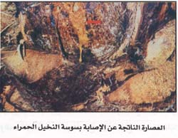 ٧ - وجود تجاويف على ساق النخلة في الإصابات المتقدمة وهذه التجاويف ممتلئة بنشارة هي نواتج تغذية اليرقات.