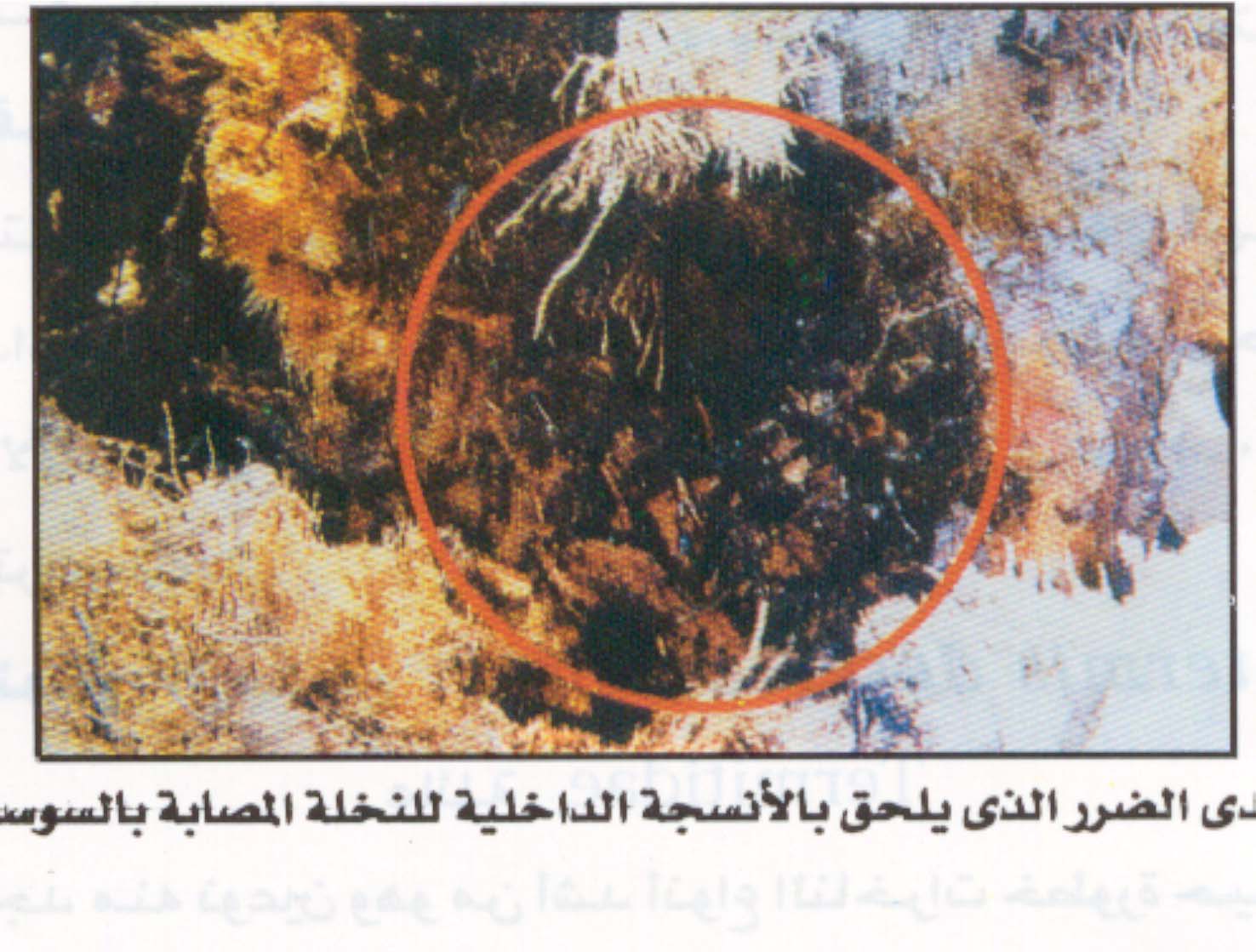 3- ظهور الإصابة في منطقة الجمارة ينتج عنها موت القمة النامية وانحنائها لأحد الجوانب مع سهولة نزع سعف القلب.
