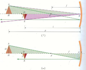 الشكل 1)): (أ) المثلثان ABH و DBE متشابهان. (ب) والمثلثان AFH و JFG متشابهان. وقد اعتبرنا ــ في النصف ــ أن انحناء المرآة صغير جداً لدرجة يمكن معها إهمال المسافة GB.