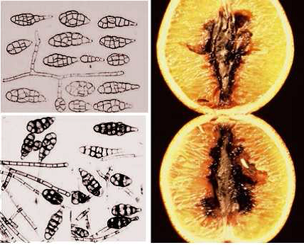 شكل يوضح العفن الاسود في ثمار البرتقال ابو سرة والشكل الثاني الجراثيم الكونيدية والميسليوم المقسم لمسبب المرض (الترناريا ستراي)