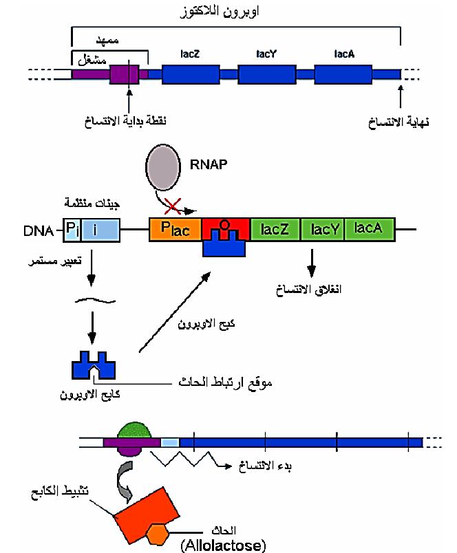 فالجين Lac I يشفر لبروتين كابح Repressor الذي يرتبط بالمشغل Operator (وهو تسلسل قصير يقعه جنب ألجين الممهد ويساعد في السيطرة على عملية التعبير الجيني) ويقوم بمنع الانتساخ عند منقطة المهمد وتسمى هذه بالسيطرة السالبة. والجينات التركيبية للكابح LacI تكون منفصلة عن باقي مكونات اوبرون اللاكتوز ويتكون الكابح بشكل غير مستحث ولكن بمعدلات واطئة وعند ارتباط المادة الحاثة الى الكابح يتغير شكله، ويصبح غير قادر على البقاء مرتبطا بمنطقة المشغل كما انه يصبح غير قادر على منع ارتباط الإنزيم RNAP الى الجين الممهد، واذا كانت الظروف الاخرى ملائما فان عملية الانتساخ تستمر وتترجم معلوماتها لتعطي Permease و β – galactosidase و Transacetylase lacZ. يشفر للأنزيم β – galactosidase الذي يفلق اللاكتوز D- glucose و D-galactose، اما lac Y فيشفر للـ Permease الذي ينقل السكر الى داخل الخلايا والحقيقة ان الانزيم الأول المحلل للاكتوز β – galactosidase يوجد بكميات قليلة ويحول للاكتوز الى كلوكوز وكلاكتوز وكجزء من فعاليته ينتج Allolactose وهو النظير التركيبي لسكر اللاكتوز، ويكون الالولاكتوز هو المادة الحاثة، ويمكن ان يستحث الاوبرون بمواد تشابه اللاكتوز من حيث الهيئة التركيبية مثل (Isopropyl β-D- thiogalactoside) IPTG والذي يطلق عليه أحياناً بالحاث المجاني لأنه يمكن ان يحث اوبرون اللاكتوز ولكنه لا يخضع لتأثير الإنزيمات الناتجة من الحث.