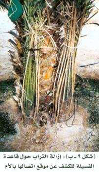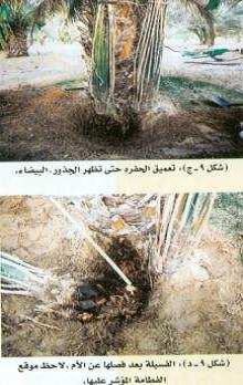 4. الكشف عن قاعدة الفسيلة بإزالة التراب ويفضل عمل حفرة باستعمال المسحاة حول القاعدة حتى يظهر موقع اتصال الفسيلة ( الفطامة) بالأم وحتى الجذور ويقطع الطويل منها.