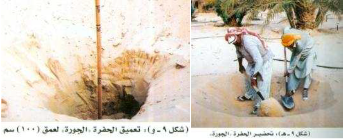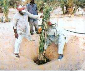 1. تبدا الزراعة بحفر موقع الفسيل على ان يكون قطر الحفرة ( 60 ) سم وعمقها (100 ) سم وفي الارض الحصوية او ذات الطبقة الصلبة الصماء القريبة من السطح تستعمل الآلات الميكانيكية ويزاح من التربة ( 2-1.5) متر مكعب ليستبدل بالرمل الجيد المفحوص . ويفضل غمر الحفرة بالماء قبل الزراعة ويجب ان تكون القلبة او الجمارة اعلى بقليل من مستوى سطح التربة ، ثم تدك التربة بالأرجل بعد الدفن تخلصاً من الجيوب الهوائية التي ربما تسبب تعفن الجذور. اما في الترب غير العميقة والحصوية وحتى الرملية الخفيفة. فيتم غرس الصرمة في داخل حفره وبنفس الطريقة السابقة حتى اذا نمت وكبرت الصرمة ، عندئذ يدفن جزء من جذع النخلة لتلافي سقوطها بسبب الرياح الشديدة. وفي المناطق التي تشتد فيها الرياح تغرس الفسيلة في حفرة عمقها ( 1.5-1) متر وتحاط بمتن منعا لدخول الماء الى الفسيلة وتروى بكمية محدودة من الماء يدوياً الى ان تنمو ويزداد ريها تدريجياً.