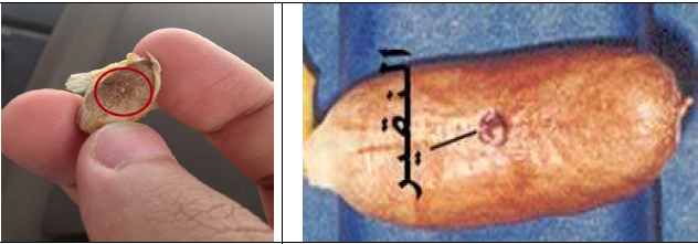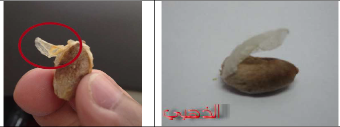 و تحت هذا النقير يوجد جسم صغير مستطيل يسمى الجنين ،وكل المادة الصلبة التي تحيط به تعد غذاء مخزوناً له فإذا توافرت الظروف من رطوبة وحرارة فإنّ الجنين سينمو بإذن الله وسيظهر من النقير ....