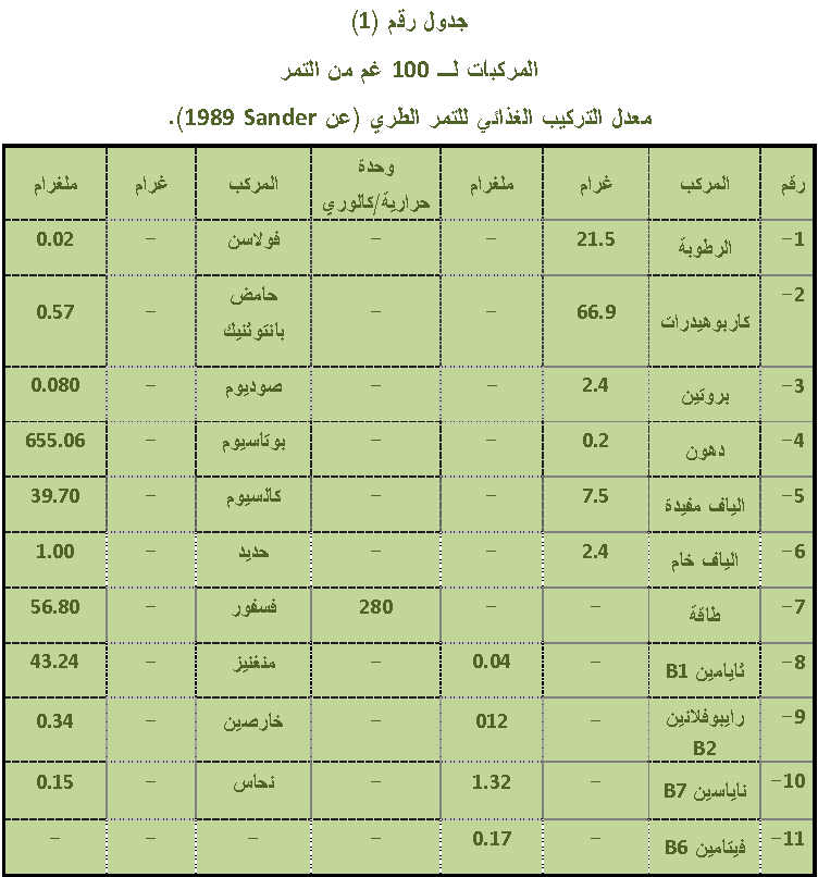 ولكونه مصدر جيد للطاقة (جدول1) يبلغ مقدار السكر في الثمار الناضجة لحد 80% ويتألف من سكر العنب وسكر الفاكهة وهي سكريات أحادية يمتصها الجسم مباشرة دون الحاجة لهضمها منتجة طاقة سريعة. وكما مبين في الجدول، فان 100غم من التمر الناضج تعطي 280 وحدة حرارية ويحتوي على البروتينات والالياف المفيدة والفيتامينات وعناصر معدنية من الكثرة حتى اعتبر التمر منجم للمعادن، من أهمها الحديد والبوتاسيوم والكالسيوم ثم الفسفور والنحاس والمنغنيز.