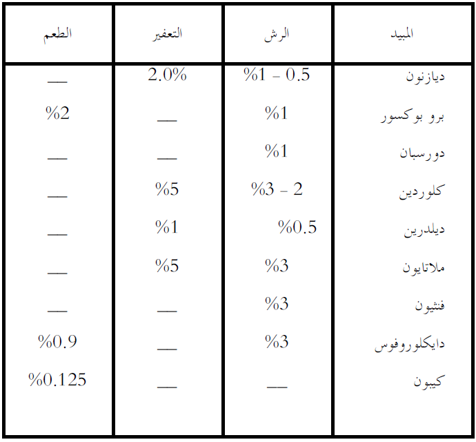 المبيدات المستعملة ضد الصراصير الحمراء التركيز حسب طريق الاستعمال