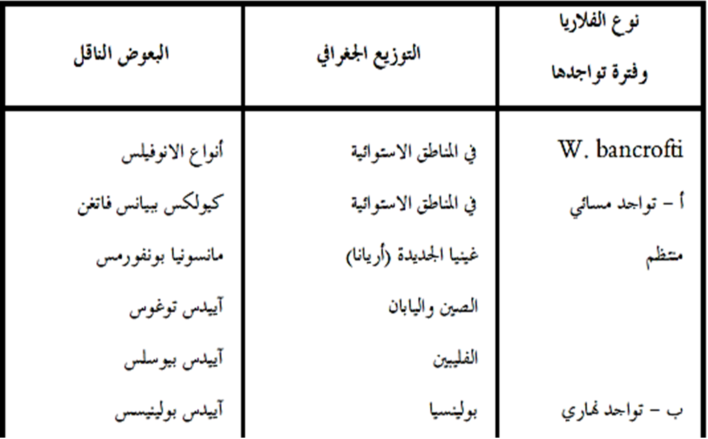 تنتشر هذه الأمراض في المناطق الاستوائية. وهذه الأمراض ليست حادة ولا تسبب الموت, ولكن أهميتها تأتي من التأثير الجانبي لها, وهو ما يسمى بـ«داء الفيل». وهذا الداء هو التضخم الشديد الذي يحدث للأطراف أو الأجزاء النابتة من الجسم مثل الثدي وكيس الصفن. و بالرغم من أن عدد الإصابات بأمراض الفلاريا تقدر بـ(٢٥٠) مليونا فإن الحالات التي نصادفها من داء الفيل لا تمثل إلا جزءا يسيرا من الإصابات , لكن لا تزال الإصابات مستمرة بالزيادة نظرا للأحياء الفقيرة التي تتزايد أعدادها على حواف المدن , حيث تهيئ اﻟﻤﺠاري المفتوحة محلات توالد جيدة للبعوض الناقل. أن معالجة هذه الأمراض لا تقل صعوبة عن تلك التي في الملاريا , ولأنها ليست حادة , فإنها لم تنل إلا القليل من الاهتمام والجهد بالرغم من أن منظمة الصحة العالمية تبذل جهودا كبيرة في إجراء المسح الشامل ووضع البرامج لمكافحة الديدان والبعوض الناقل. إن أمراض الفلاريا حالات تسببها ديدان خيطية تعود إما للجنس «ووشريريا » أو «بروجيا ». فالنوع بنكروفتي (في الجنس الأول) ذو أهمية خاصة وهو ينتشر في المناطق الاستوائية بكثرة ولا يصيب إلا الإنسان. أما أنواع الجنس الثاني فإنها تنتشر في جنوب شرق آسيا وتضم أنواعا تصيب الحيوانات فقط. دورة حياة جميع الأنواع متشابهة بصورة عامة. الدودة البالغة خيطية , طولها بضعة سنتمترات تعيش في الأنسجة اللمفية والضامة. تضع الإناث اﻟﻤﺨصبة عددا كبيرا من اليرقات اﻟﻤﺠهرية , طولها حوالي ربع الملم , تتناوب بتواجدها بين الدم المحيطي والدم الداخلي (في الرئة والأوعية الرئيسة) لا تتمكن هذه اليرقات اﻟﻤﺠهرية من النمو والوصول إلى دور البلوغ حتى تمر بحيوان لا فقري وهو هنا من البعوض , وقد يكون تواجدها في الدم المحيطي هو تحوير وتكيف في حياتها بحيث تكون قريبة من السطح عندما تتغذى البعوضة لكي تأخذها مع الدم. فالبعوض الناقل لدورة بنكروفتي يتغذى بالليل , لذلك فاليرقات اﻟﻤﺠهرية تكثر في الدم المحيطي بالليل , بين العاشرة بعد الظهر والثانية صباحا , ولكن هناك تحت نوع من هذه الدودة في الشرق الأقصى يكثر وجوده في الدم المحيطي نهارا , لأن البعوض الناقل هناك يتغذى نهارا. عندما تعود اليرقة اﻟﻤﺠهرية المعدية من البعوضة إلى الإنسان.