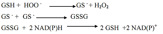 اما انزيم تخليق الكلوتاثايون فيكون مهما لان الكلوتاثايون يعد من مضادات الاكسدة المهمة والتي تتخلق بواسطة الانزيم Glutathione synthetase ووجود كميات كبيرة منه تجعل البيئة الداخلية للخلية مختزلة، ويتفاعل الكلوتاثايون GSH مع بيروكسيد الهيدروجين او O2- او HOO• ليعطي جذور الكلوتاثايون GS التي سرعان ما تزدوج لتكون GSSG، ويقوم الانزيم Glutathione reductase بنقل الالكترونات من NAD(P)H الى الكلوتاثايون المؤكسد GSSG لغرض استعادة الشكل المختزل GSH ليمارس وظيفته في الخلية وفق المعادلات الاتية