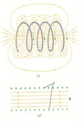 يمكننا عمل ملف لولبي لو أننا قمنا بلف السلك على شكل حلزوني ليصبح ، ذو لفات متباعدة ومفككة أكثر من المعتاد. ففي العادة يتم لف الملف اللولبي بحيث تتلامس اللفات المتجاورة. وعند مقارنة ما جاء في الشكل ((1 بالمجال الناشئ عن حلقة منفردة في الشكل (2 ب) فإننا نكتشف أن مجالات اللفات المتجاورة تجمع كلها معاً لتكون المجال النهائي. ويبين الجزء ( 2ب) من الشكل مقطعاً مستعرضاً في جزء من ملف لولبي محكم اللف. وكما يدل الشكل فإن المجال المغناطيسي بداخل الملف يكون منتظماً تقريباً. وهكذا فإن مقدار المجال المغناطيسي داخل ملف لولبي مجوف ويحمل تياراً I، ويتكون من n حلقة من السلك في كل متر من طوله هو :