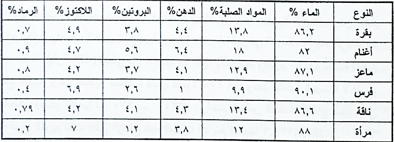 جدول يوضح محتوى الحليب لبعض الأنواع الحيوانية والإنسان