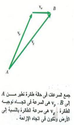 لنأخذ كمثال حالة طائرة تريد أن تطير في خط مستقيم من مدينة ما A إلى أخرى B في وجود رياح ثابتة السرعة. لدينا هنا ثلاث سرعات: الأول سرعة الرياح بالنسبة إلى الأرض vw ، والثانية هي سرعة الطائرة في اتجاه توجيهها vp وهي سرعة الطائرة في هذا الاتجاه إذا كان الهواء ساكناً ، وأخيراً سرعة الطائرة بالنسبة إلى الأرض vg وهي في اتجاه إزاحة الطائرة. وواضح من الشكل 2)ب) أن هذه السرعة هي محصلة السرعتين الاخريين.