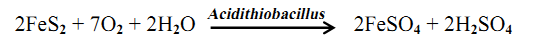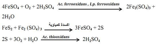 - الطريقة غير المباشرة ويكون ذلك عن طريق ايون الحديديك الذي ينتج من اكسدة الميكروبات لأيونات الحديدوز الموجودة في الاملاح ولا تحتاج الخلايا ان تكون ملامسة للخامات. كما في المعادلة الآتية :