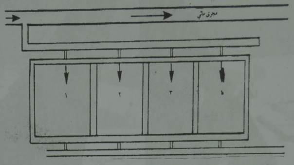 2- الاحواض المتوازية: تكون تغذية الاحواض بالمياه بشكل افرادي, فلكل حوض فتحة تغذية يصل اليها الماء من المصدر المباشر وفتحة تصريف تصب في القناة الرئيسية.