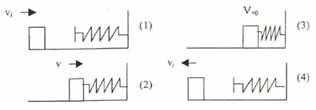 الحالة (1): تمثل جسم يتحرك بسرعة (vi) باتجاه نابض في حالة استقرار دون أن يلامسه. الطاقة الميكانيكية للمنظومة تساوي مجموع الطاقة الميكانيكية للجسم والنابض: