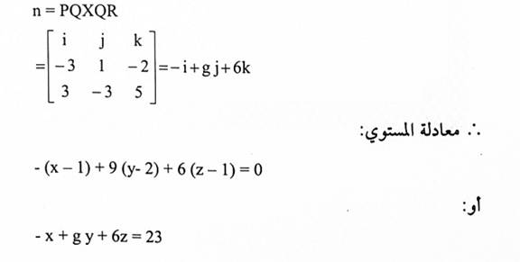 5- أوجد معادلة المستوى المار بالنقاط P (1,2,1) و P (-2,3,-1) و Q (-2,3,-1) و R (1,0,4).