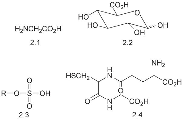 The phase two changes involve linking a water-solubilizing group to the drug. The common groups are glucuronic acid 2.2, which is provided by uridine-5-diphosphate a-D-glucuronic acid, the sulfate 2.3, which is provided by 30-phosphoadenosine-50-phosphonosulfate and the amino acids, glycine 2.1 and taurine. An important conjugation utilizes the tripeptide glutathione 2.4.