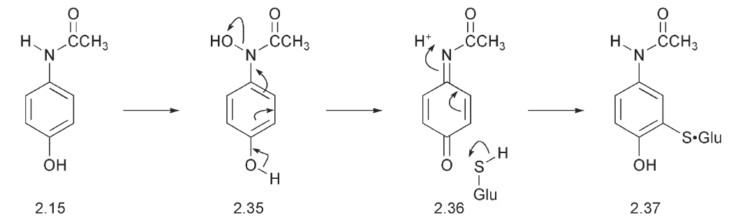 This possesses a thiol, which is a powerful nucleophile that can add to electron-deficient carbon atoms. Since electron-deficient centres can be created by oxidative processes and might otherwise be attacked by free amino groups of nucleic acids and proteins, the glutathione conjugation serves to protect the liver from damage. An example is provided by the metabolism of paracetamol. Oxidation of paracetamol takes place on the nitrogen with the formation of an N–OH 2.35 and this leads, after elimination to the quinone-imine 2.36. The latter is very electron-deficient and readily adds nucleophiles such as the NH2 from a protein. The consequence of this addition is that the paracetamol becomes bound to the liver causing liver damage. Glutathione 2.4 provides protection against this by adding to the quinone imine 2.36 to give a conjugate 2.37. If there is insufficient glutathione in the liver and the amount available is exhausted as in a paracetamol overdose, liver damage with potentially fatal consequences, ensues. Treatment involves the rapid administration of a thiol containing drug such as methionine or acetylcysteine.