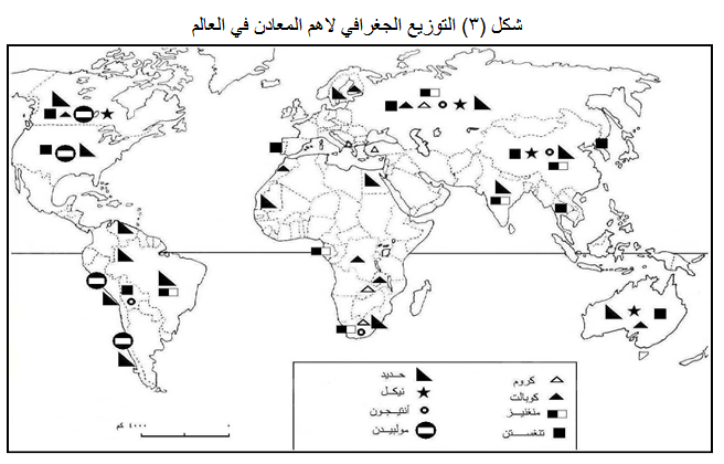 المعدنية، نلاحظ أن الموارد المعدنية تتوزع بشكل محدود على سطح الأرض يتوافق مع توزع التكوينات الصخرية المتباينة حسب التركيب الجيولوجي، وعلى عكس الأقاليم الزراعية التي تتوزع بشكل أوسع نسبياً من المعادن، نلاحظ أن الخامات المعدنية تتميز بتركيزها في مناطق محدودة من سطح الأرض، كما هي الحال في تركيز خامات النيكل في كندا والذهب والكروم في جنوب إفريقيا والنحاس في زامبيا والفوسفات في المغرب العربي والبترول في منطقة الخليج العربي. طبعاً هذا لا يعني عدم وجود هذه المعادن خارج المناطق المذكورة سابقاً، وإنما يكون وجودها في المناطق الأخرى من سطح الأرض بشكل أقل مما هو عليه في تلك المناطق بحيث لا يسمح بالاستثمار الاقتصادي لهذه المعادن في معظم الأحيان.