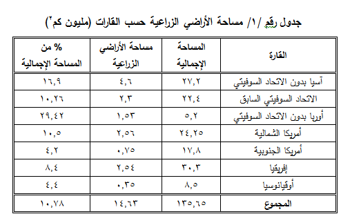 تبلغ مساحة الأراضي الزراعية في العالم نحو 14.6 مليون كم2، أي ما يعادل 10% من مساحة اليابس، ولكن بسبب تباين الظروف المناخية والتضاريس من ناحية واختلاف المقدرة البشرية على استغلال الأراضي من ناحية ثانية، نلاحظ أن هذه المساحة تتوزع على القارات بشكل متفاوت، بحيث تكون أعلى نسبة للأراضي الزراعية في القارة الأوربية 31% من المساحة الإجمالية للقارة، بسبب وقوعها في عروض معتدلة، وارتفاع مستوى التقدم التقني لسكان هذه القارة، أما روسيا وكندا فإن جزءاً كبيراً من أراضيهما إما صحارى جليدية و إما غابات مخروطية ومراعي. وهذا ما يفسر انخفاض نسبة الأراضي الزراعية في كل من أمريكا الشمالية. ومجموعة الدول المستقلة (الاتحاد السوفيتي).