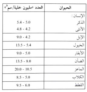 جدول 1 :عدد خلايا الدم الحمراء في بعض الحيوانات