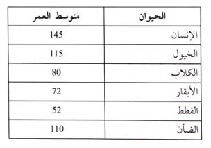 جدول 1 : متوسط عمر خلايا الدم الحمراء بـ(الأيام) لبعض الحيوانات