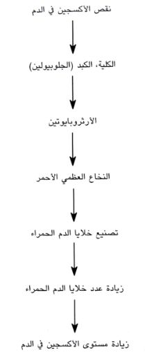 تتأثر عملية تصنيع خلايا الدم الحمراء بشكل رئيسي بمستوى الأكسجين في الدم (Hypoxemia)" لأي سبب من الأسباب يعمل وبشكل مباشر على زيادة تصنيع خلايا الدم الحمراء من النخاع العظمي الأحمر (شكل 1).