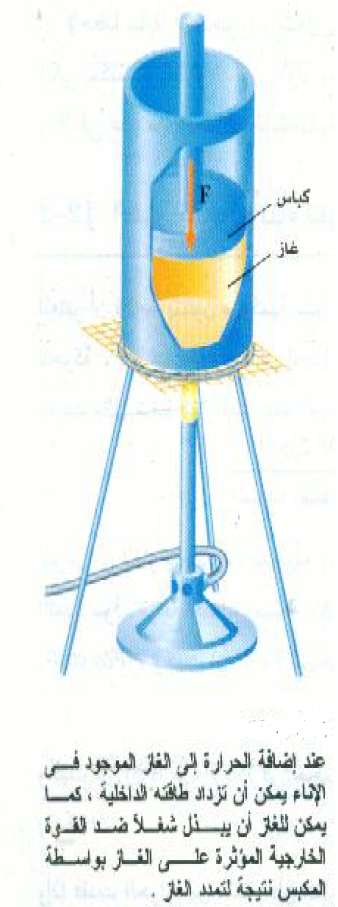 لكل نظام في حالة معينة كمية محدودة من الطاقة الداخلية ، وإننا نتساءل الآن عما يحدث للنظام عندما تنساب إليه كمية من الحرارة. هذه الطاقة المضافة يمكن أن تستعمل بطريقتين: (1) زيادة الطاقة الداخلية للنظام، أو (2) إمداد النظام بالطاقة التي يحتاجها لكي يبذل كمية من الشغل w على الوسط المحيط به. فإذا أخذنا النظام الموضح بالشكل (1) والذي يمثل غازاً في أسطوانة فإننا سنجد أن الطاقة المضافة يمكنها أن تسبب تغيرين في النظام: (1) رفع درجة حرارة الغاز ومن ثم زيادة طاقته الداخلية، (2) تمدد الغاز مما يؤدي إلى رفع الكباس إلى أعلى مما يسمح للغاز بأن يبذل شغلاً على الكباس.