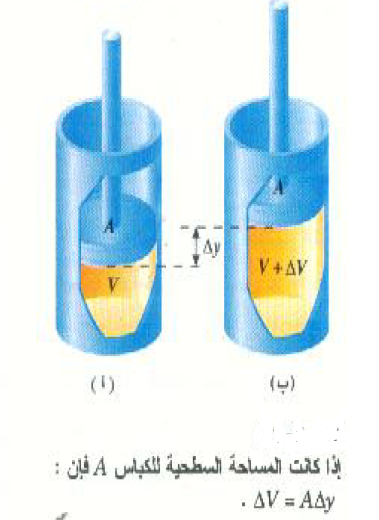 حيث θ هي الزاوية بين متجه القوة ومتجه الإزاحة. ويلاحظ في الشكل ((1 أن القوة التي يؤثر بها الغاز على الكباس إلى أعلى تساوي F (بفرض أن الكباس يتحرك بسرعة ثابتة). وعندما يتحرك الكباس إلى أسفل مسافة قدرها sΔ فإن الشغل المبذول بواسطة الغاز سيكون: