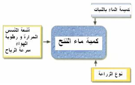 * الإشعاع الشمسي وحرارة ورطوبة الجو وسرعة الرياح (كلما كان الجو حارا وجافا والرياح قوية إلا وزاد النتح).