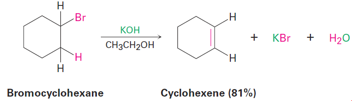 The two most common elimination reactions are dehydrohalogenation the loss of HX from an alkyl halide—and dehydration—the loss of water from an alcohol. Dehydrohalogenation usually occurs by reaction of an alkyl halide with strong base such as potassium hydroxide. For example, bromocyclohexane yields cyclohexene when treated with KOH in ethanol solution.