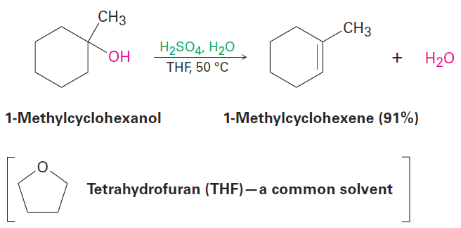 Dehydration is often carried out in the laboratory by treatment of an alcohol with a strong acid. For example, when 1-methylcyclohexanol is warmed with aqueous sulfuric acid in tetrahydrofuran (THF) solvent, loss of water occurs and 1-methylcyclohexene is formed.