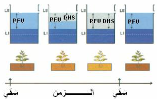 1 - من المعايير العامة هناك القيام بالري عندما يصل عجز الماء في التربة مستوى الرطوبة سهلة الاستعمال، بالرجوع إلى الاحتياجات الخامة للري.