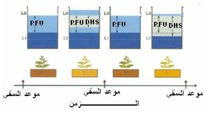 4- وتوجد بالنسبة للكثير من أنظمة الري (وخصوصا الري بالجاذبية) قيودا وشروطا لاختيار موعد الري لأن الري قد يكون منظما بين مجموعة من الفلاحين بالتناوب، لذا فلا يمكن أن تجري العملية إلا عندما يصل دورك. وفي هذه الحالة يمكن أن يتعدى عجز الماء في التربة مستوى الإنهاك المتاح حيث أن الري يصير مستعجلا وضروريا، وهنا يلجأ المزارع إلى استعمال كمية الماء حسب الاحتياجات الخامة، أي أنه يملأ التربة ماء احتسابا لتأخر دوره في الري.
