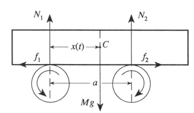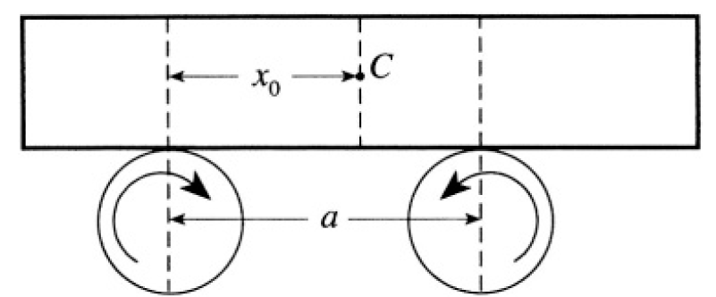 a) Assume that the rollers rotate in opposite directions. The coefficient of kinetic friction between the bar and the rollers is μ. Write the equation of motion of the bar and solve for the displacement x(t) of the center C of the bar from roller 1, assuming x(0) = x0 and