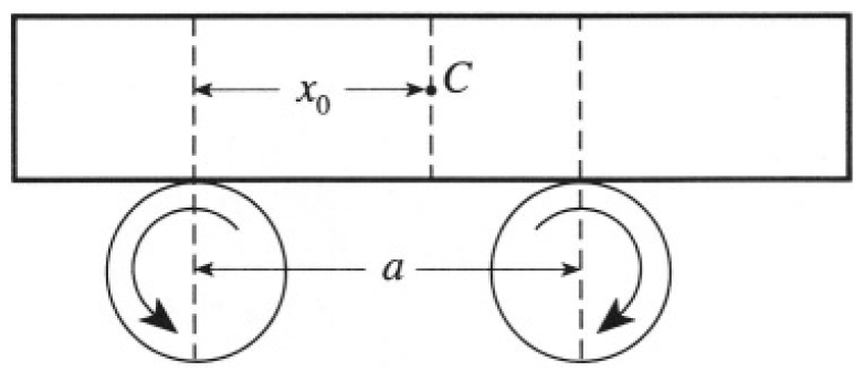 A uniform thin rigid rod of mass M is supported by two rotating rollers whose axes are separated by a fixed distance α. The rod is initially placed at rest asymmetrically, as shown in Figure 1.1a.