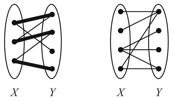 Before we see Hall’s classic matching theorem, we need to define one more term. If G is a bipartite graph with partite sets X and Y , we say that X can be matched into Y if there exists a matching in G that saturates the vertices of X. Consider the two examples in Figure 1.3. In the bipartite graph on the left,