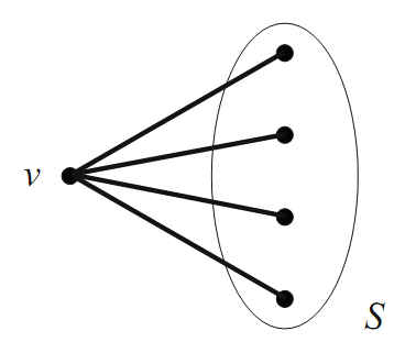 Case 1. Suppose that v is incident with at least four red edges. Call the end vertices of these edges “red neighbors” of v, and let S be the set of red neighbors of v (see Figure 1.8).