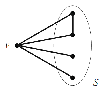Since S contains at least four vertices, and since R(2, 4) = 4, the 2-coloring of the edges that are within S must produce either a red K2 or a blue K4 within S itself. If the former is the case, then we are guaranteed a red K3 in G (see Figure 1.9). If the latter is the case, then we are clearly guaranteed a blue K4 in G.