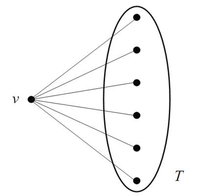 Case 2. Suppose that v is incident with at least six blue edges. Call the other end vertices of these edges “blue neighbors” of v, and let T be the set of blue neighbors of v (see Figure 1.10). Since T contains at least six vertices, and since R(3, 3) = 6, the 2-coloring of the edges that are within T must produce either a red K3 or a blue K3 within T itself. If the former is the case, then we are obviously guaranteed a red K3 in G.