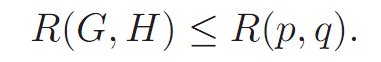 Proof. Let n = R(p, q), and consider an arbitrary 2-coloring of Kn.By definition ,Kn contains either a red Kp or a blue Kq. since G ⊆ Kp and H ⊆ Kq, there must either be a red G or a blue H in Kn. Hence, R(G,H) ≤ n = R(p, q). Here is a result due to Chva´ tal and Harary [7] that relates R(G,H) to the chromatic number of G, χ(G), and the order of the largest component of H, denoted by C(H).