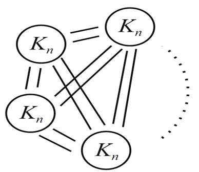 Proof. Let m = χ(G) − 1 and let n = C(H) − 1. Consider the graph S formed by taking m copies of Kn and adding all of the edges in between each copy (Figure 1.13). Actually, S = Kmn. Now color all of the edges within each Kn blue, and color all other edges red. From the way we have constructed the coloring, every red subgraph can be vertex colored with m colors. Since m< χ(G), there can be no red G present. Furthermore, any blue subgraph has at most n = C(H) − 1 vertices in its largest component. Hence, there can be no blue H present. We have exhibited a 2-coloring of Kmn that contains neither a red G nor ablue H.