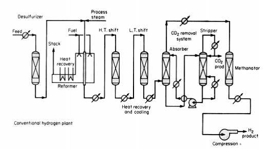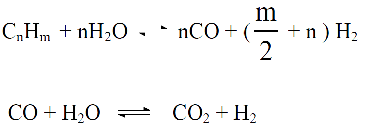تتم هذه العملية بمفاعلة مزيج من البخار والهيدروكربونات تحفيزياً عند درجة حرارة مرتفعة لتشكيك مزيج من H2 واكاسيد الكربون . وبحدث التفاعلان الاساسيان التاليان :
