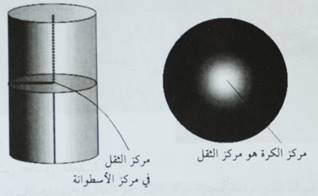 مركز ثقل الكرة هو مركزها الهندسي، ومركز ثقل الاسطوانة هو مركزها، كما في الشكل التالي: