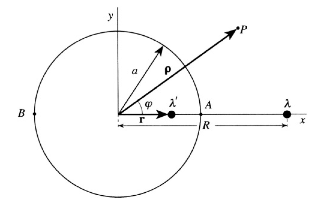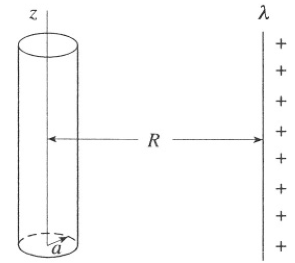 The axis of a long, thin-walled, conducting, uncharged cylindrical shell of radius a is oriented along the x-axis as shown in Figure 1.1. A long, thin wire carrying a uniform linear charge density +λ runs parallel to the cylinder, at a distance R from the center. Use the method of images to find the electric potential in the x - y plane.