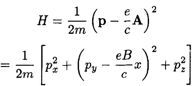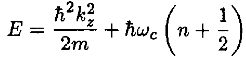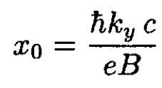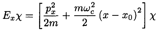 The energy is given by the component Ez along the magnetic field and the energy Ex for motion in the (x, y) plane. The latter contribution is identical to the simple harmonic oscillator in the x-direction. The frequency is the cyclotron frequency ωc, and the harmonic motion is centered at the point x0 which depends upon ky. The eigenvalues and eigenfunctions are